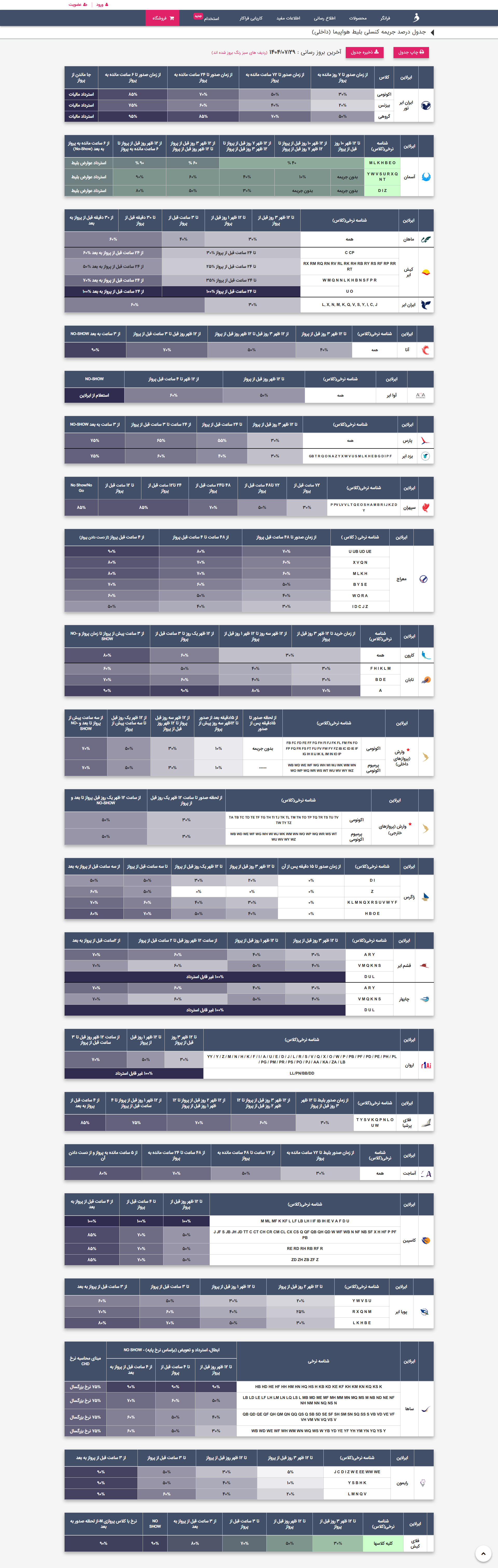 | ایرلاین | شناسه نرخی(کلاس) | تا 12 ظهر 10 روز قبل از پرواز | از 12 ظهر 10 روز قبل از پرواز تا 12 ظهر 7 روز قبل از پرواز | از 12 ظهر 7 روز قبل از پرواز تا 12 ظهر 3 روز قبل از پرواز | از 12 ظهر 3 روز قبل از پرواز تا 12 ظهر روز قبل از پرواز | از 12 ظهر روز قبل از پرواز تا 6 ساعت مانده به پرواز | از 6 ساعت مانده به پرواز به بعد (No-Show) | |